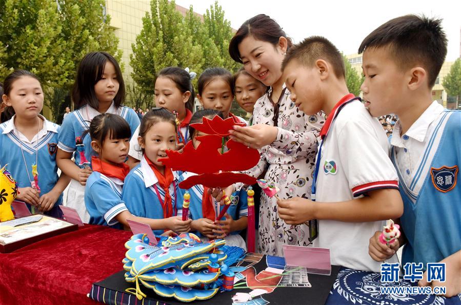 9月20日,河北邢台经济开发区思源实验学校老师向学生介绍庆阳香包。 新华社记者朱旭东摄