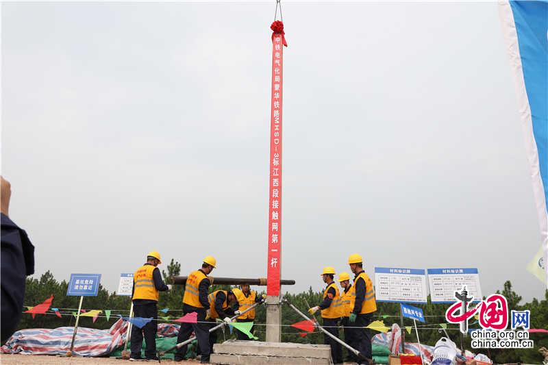 中国网讯 9月21日,中铁电气化局一公司承建的蒙华铁路3标江西段“四电”工程接触网第一杆在江西省吉水县成功组立,标志着蒙华铁路江西段四电工程开始全面施工。