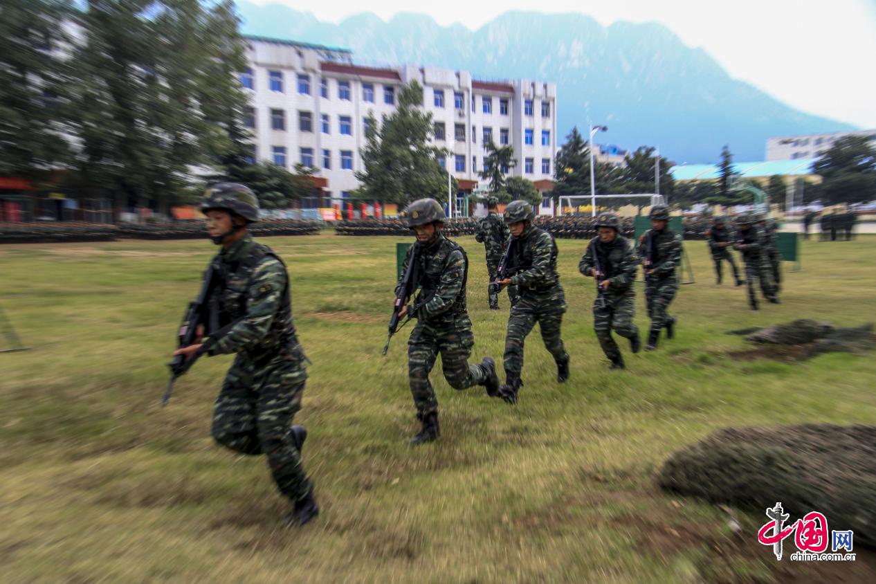 为新兵演示课目的老兵呐喊着奔向训练场。蔡霖伟摄