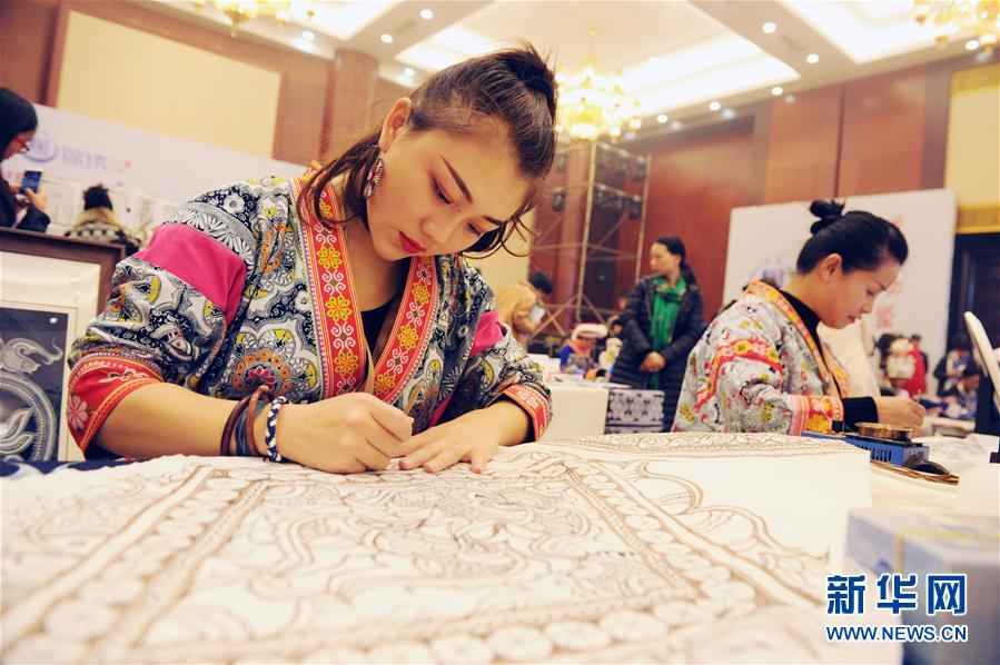10月11日,参赛选手在比赛现场刺绣。 当日,“圆梦锦绣·巧手脱贫”贵州省妇女特色手工技能暨创新产品大赛在贵阳市举行。来自贵州省各地的参赛选手分别就民族刺绣、民族蜡染、创新产品设计等进行现场比拼。 2013年,贵州省启动“锦绣计划”,促进妇女实现家门口就业创业、脱贫致富。“锦绣计划”实施五年来,培训妇女6.5万人次,帮助全省众多妇女织就脱贫致富路。 新华社发(杨文斌 摄)