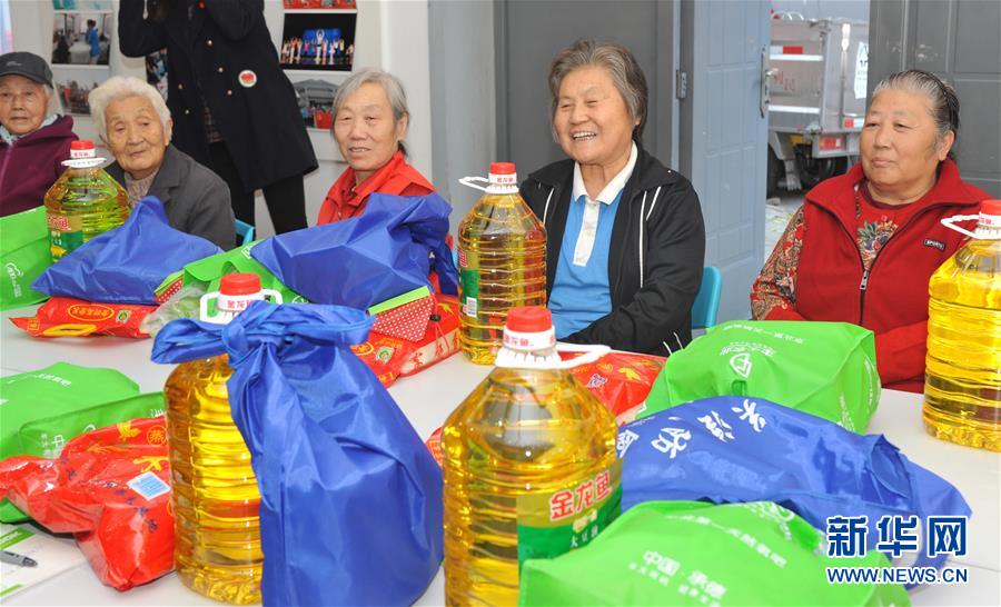 10月17日,在北京市西城区广内街道为老服务中心,老人们收到节日粮油等生活用品。 新华社记者 赵宇思 摄