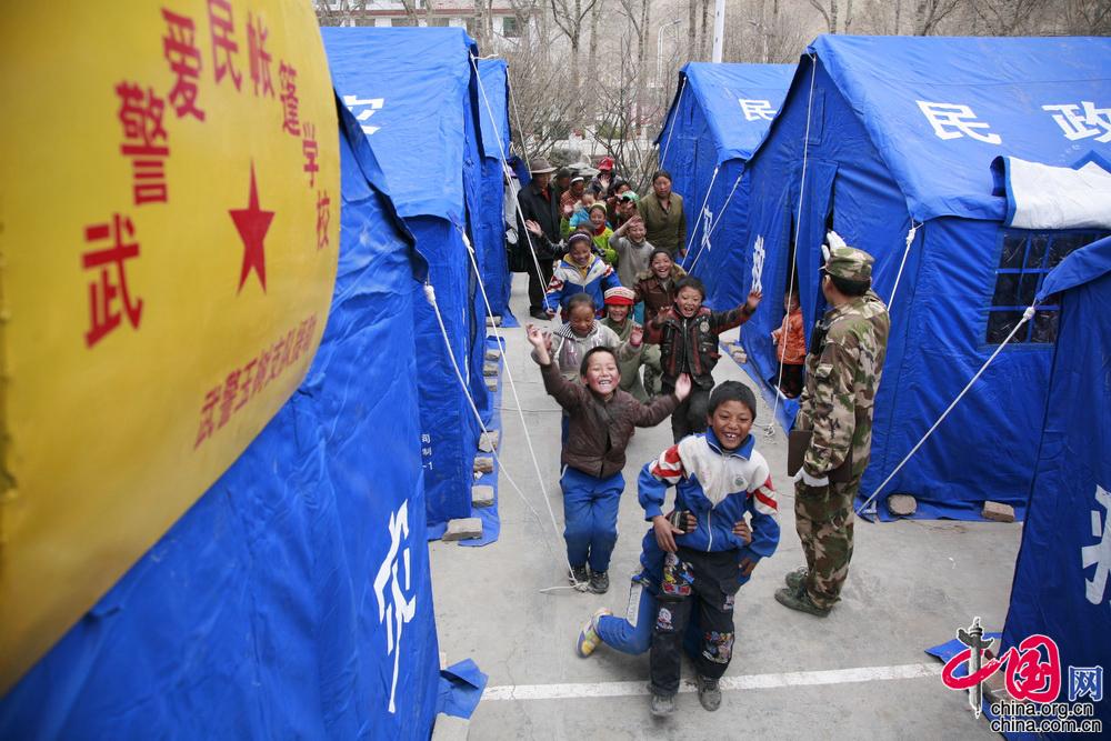 为了不让灾区的孩子们落下功课,武警玉树支队官兵搭建了“帐篷学校”,“兼职”当起了孩子们的老师。至今,孩子们走在大街上看到当时的“老师”,依然会亲切地喊做“老师”。(图片由武警玉树支队提供)