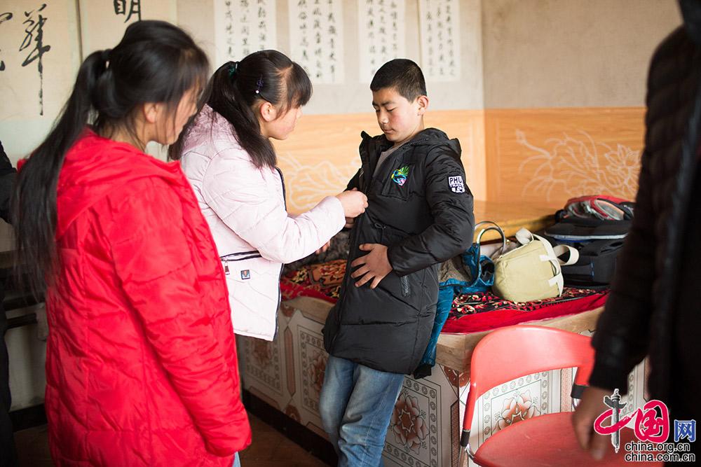 集善残疾儿童助养项目的工作人员为彬彬送来了一件过冬的羽绒服。近几年,在政府和集善残疾儿童助养项目的帮助下,彬彬康复效果较为理想,可以和别人正常交流。家里的生计正在好转,家居环境也得到了改善。