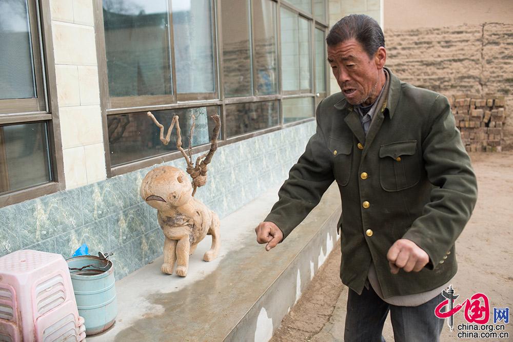 彬彬的父亲也是先天性听力障碍,不能听、不能说。他比划着各种手势,试图向人介绍自己用树根雕的一个“狮子”。