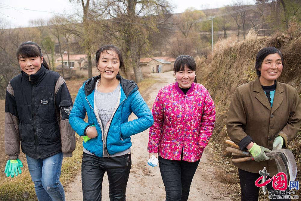 早饭后,彬彬的母亲带着彬彬的三个姐姐下地。彬彬家姐弟一共6人,大姐、二姐有先天性听力障碍,三姐(右2)曾因意外摔伤导致腰椎压缩性骨折,后在当地残联帮助下,幸运地筹集到手术费,逐渐恢复健康。
