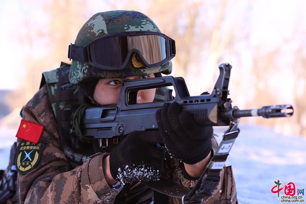 12月16日,武警兵团总队执勤第五支队特战队员正在雪地中设伏待击。