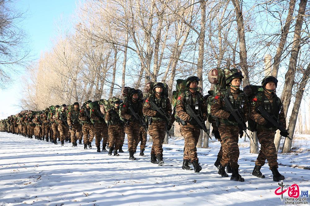12月16日,武警兵团总队执勤第五支队特战队员正在雪地行军。