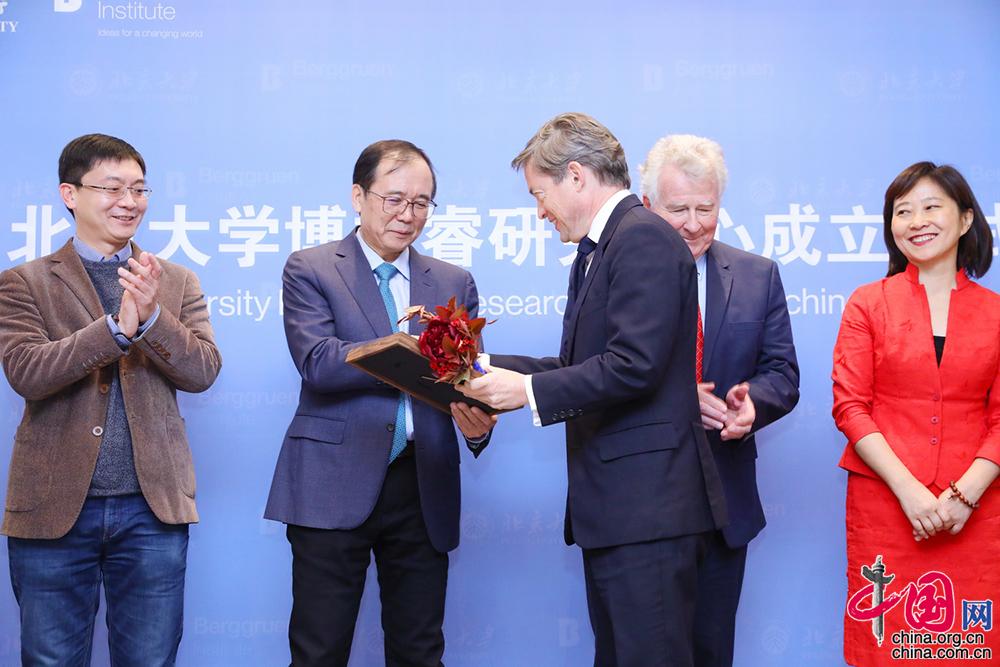 博古睿研究院主席、创始人尼古拉斯 ·博古睿(Nicolas Berggruen)向北京大学前校长林建华颁发聘书。(曹倩倩摄)