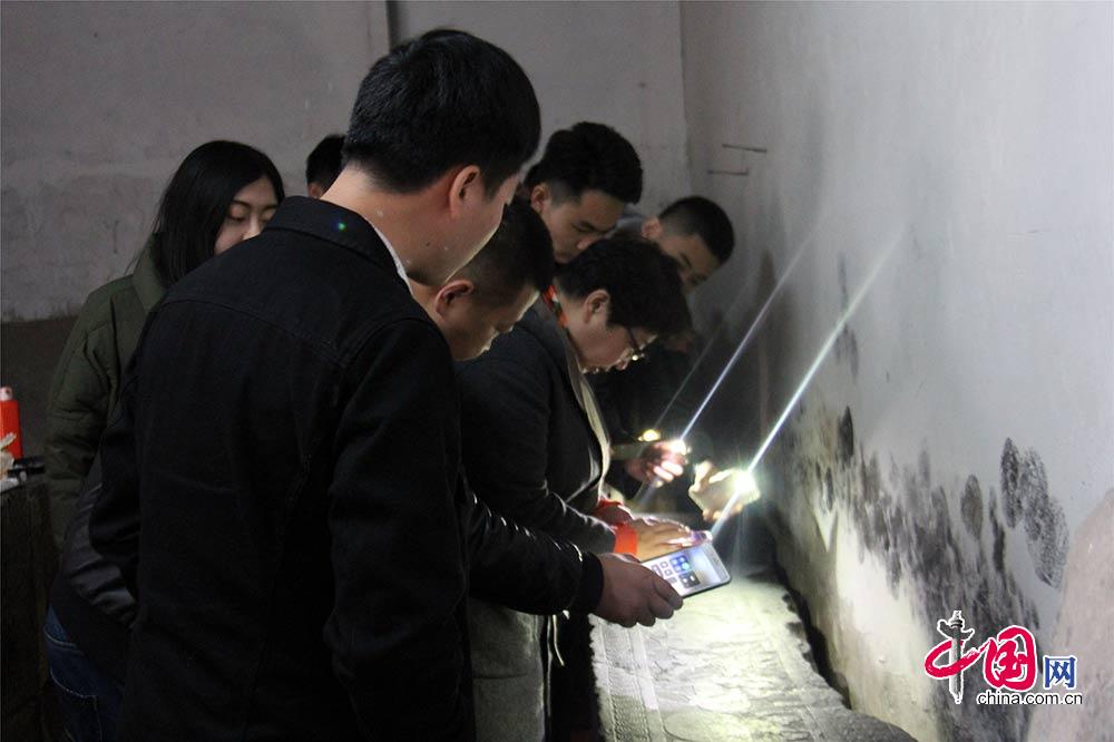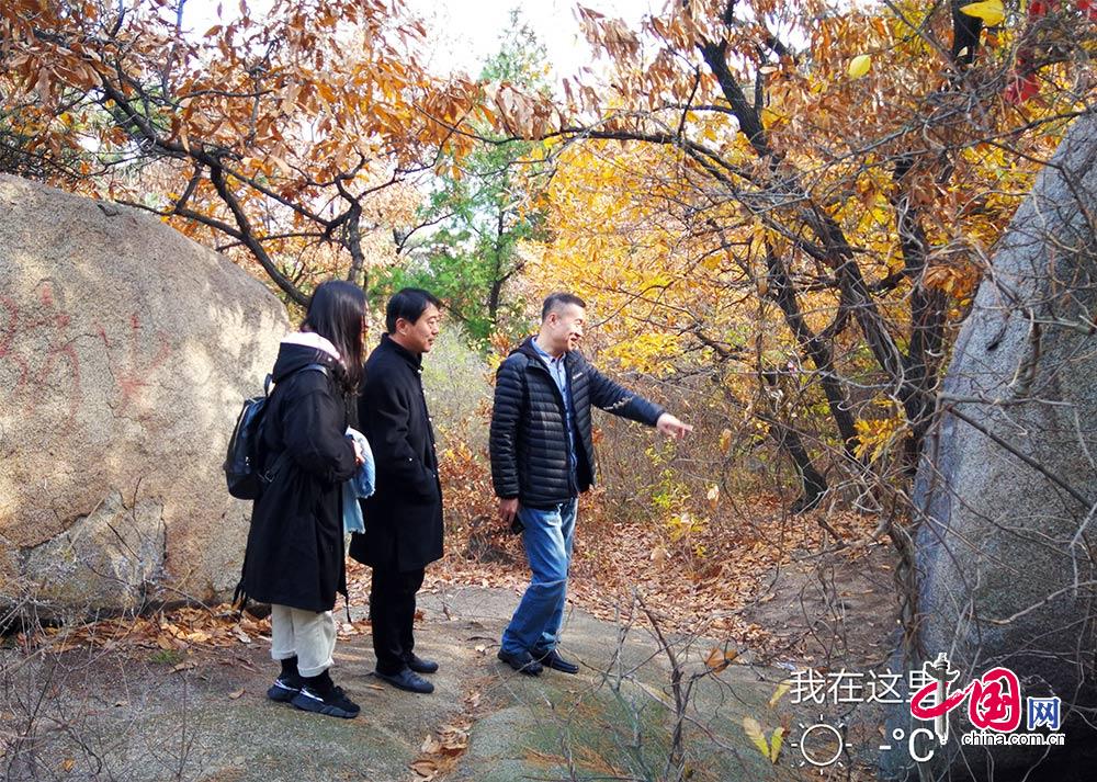 考察人员穿行在岗山刻经狭窄崎岖的山路上。