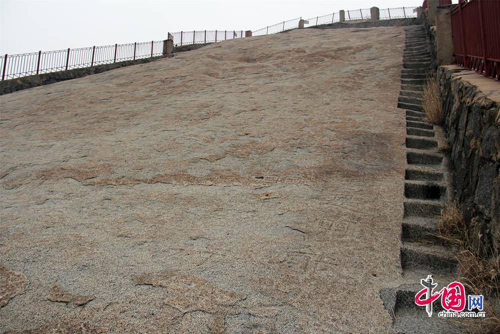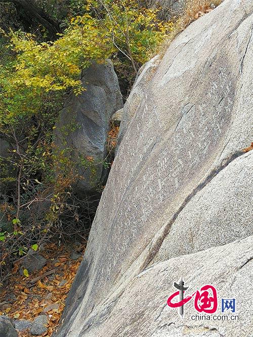 岗山摩崖不像铁山摩崖那样集中于一处,而是分散在三十多块巨石之上。这些巨石,散布在岗山北麓俗称“狼沟”的地方。因为刻石并不集中,所以寻访这些刻石,要在崎岖蜿蜒的深山小路上蹀躞而行。