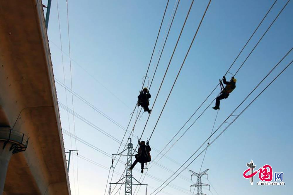 中铁电气化局一公司项目员工正在架设接触网导线。