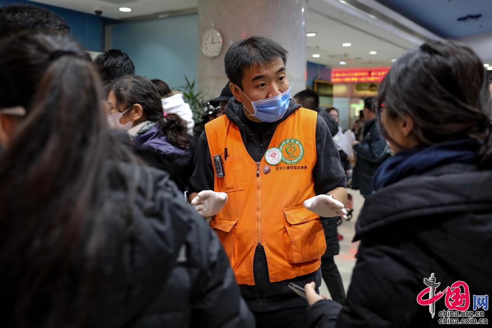 在急诊科的接诊大厅里,小患儿的病痛牵动着每一个家长的心,使得他们的行动匆忙慌乱了很多。身着黄色马甲的志愿者有条不紊的引导患者家长挂号,帮助送诊,并解答患儿家长一些简单的问题。中国网记者 郑亮摄