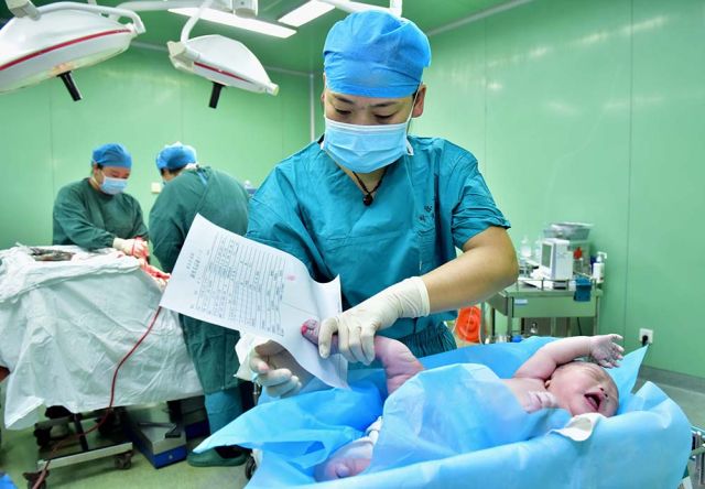 2019年1月1日,在河北石家庄新乐市医院手术室,一名护士在为新生儿按脚印。
