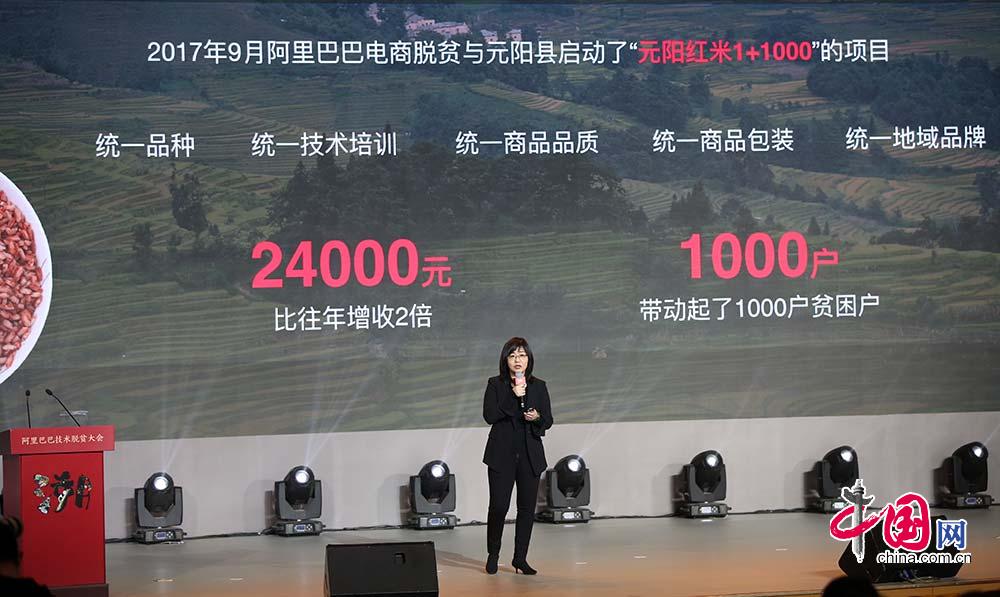 阿里巴巴脱贫基金电商脱贫执行组长、阿里巴巴集团农业发展部总经理黄爱珠通过分享助销元阳红米、奉节脐橙等农业物产帮助当地村民脱贫的案例,总结阿里巴巴通过电商脱贫方式一年来的成绩。中国网 赵娜摄影