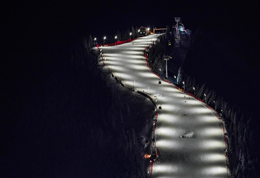 2月7日,滑雪爱好者在丝绸之路国际滑雪场的夜场中练习滑雪。来源:新华社
