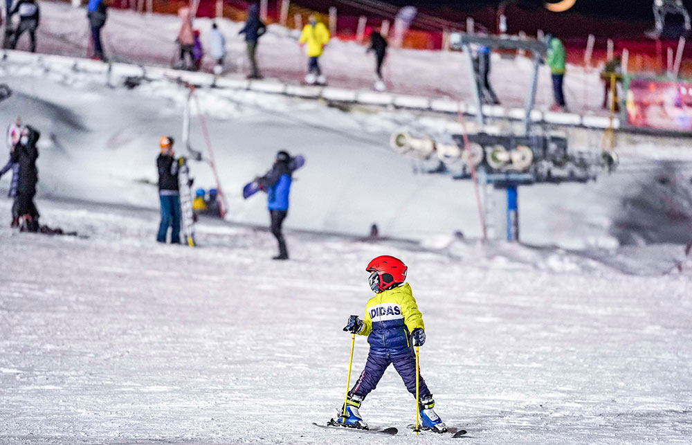 2月7日,一位小朋友在丝绸之路国际滑雪场的夜场中练习滑雪。来源:新华社