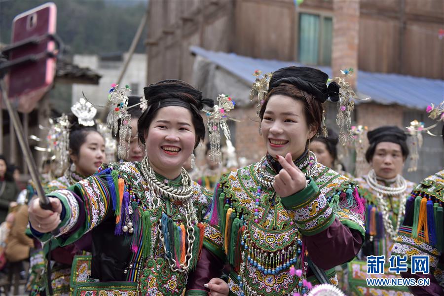 2月8日,在贵州省榕江县朗洞镇高便村,侗族同胞在自拍。当日是大年初四,贵州省黔东南苗族侗族自治州榕江县朗洞镇高便村的侗族同胞身穿盛装,弹唱琵琶歌踩歌堂,欢度新年。新华社发(蒋佐仙 摄)