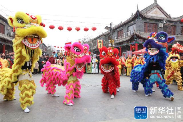 2月10日,民间艺人在河北邯郸市广府古城庙会上表演舞狮。(杨扬 摄)