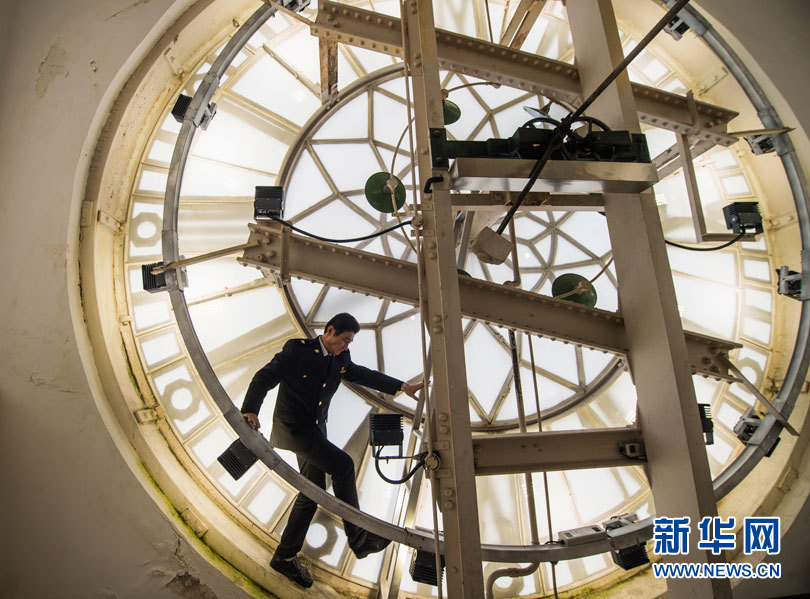每面都用100多块12角棱形图案的乳白色特制钢化玻璃拼成,装有自动开的电灯72盏,晚上通体明亮,斗大的数字在几里外也清晰可见。钟面上的紫铜分针长3.17米,重49公斤;紫铜时针长2.3米,重37.5公斤。新华网吴恺 摄