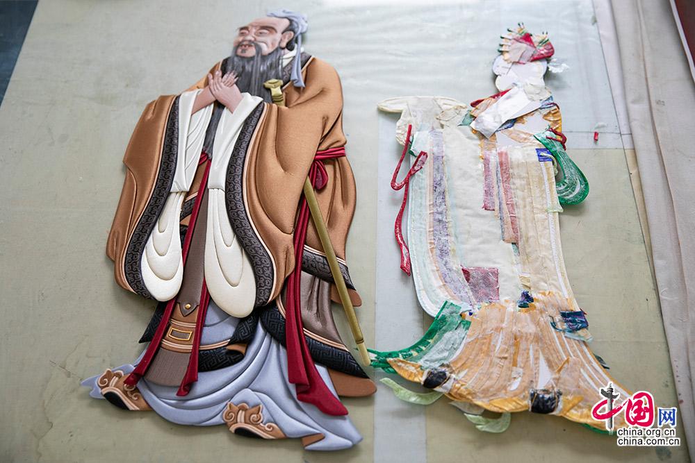 一幅堆锦作品从构思创作开始,基本要经过:画稿、描稿、分拆、塑型、包丝绸、染色、描绘、拼堆、调型、拼接、上板、定型等十几道工序。仅作品中的一个人物,就需要几十甚至上百个部件拼接。中国网记者 董宁 摄影