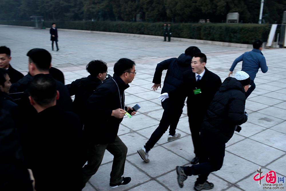 3月5日,第十三届全国人民代表大会第二次会议在北京人民大会堂开幕。参加采访的记者凌晨就在大会堂前排起了长队等待入场,图为记者们负重以百米冲刺的速度奔入会场抢占机位。中国网 杨佳摄影