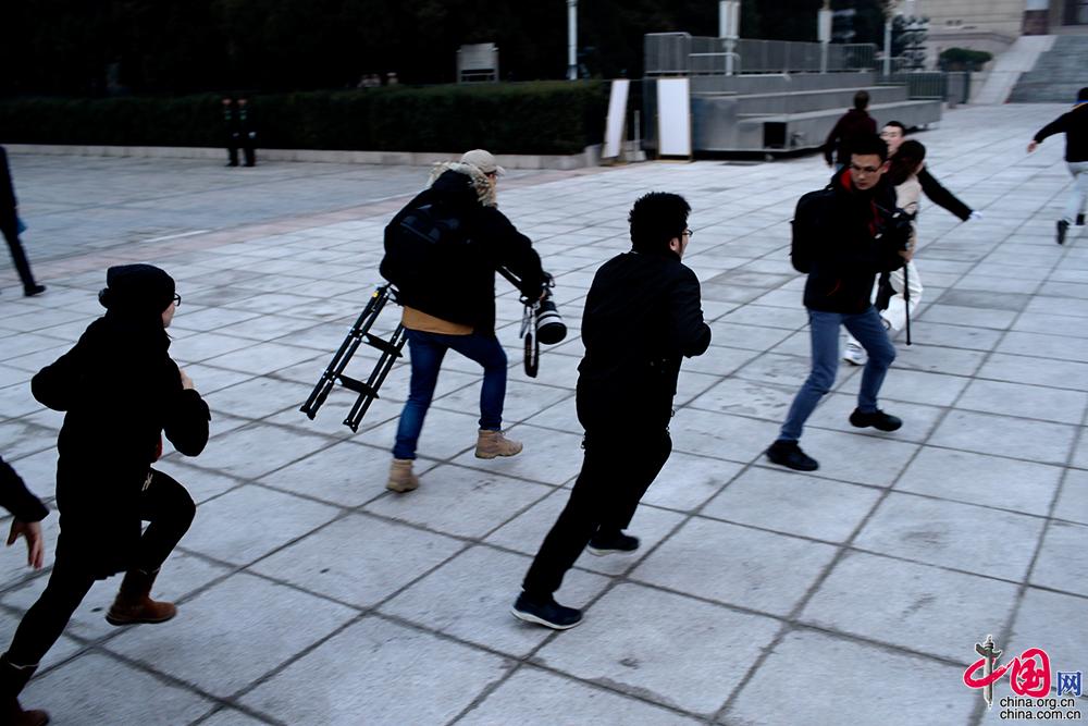 3月5日,第十三届全国人民代表大会第二次会议在北京人民大会堂开幕。参加采访的记者凌晨就在大会堂前排起了长队等待入场,图为记者们负重以百米冲刺的速度奔入会场抢占机位。中国网 杨佳摄影