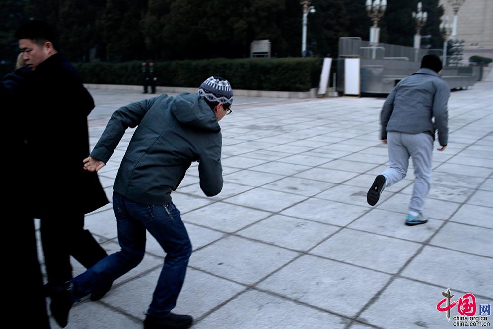 3月5日,第十三届全国人民代表大会第二次会议在北京人民大会堂开幕。参加采访的记者凌晨就在大会堂前排起了长队等待入场,图为记者们负重以百米冲刺的速度奔入会场抢占机位。中国网 杨佳摄影