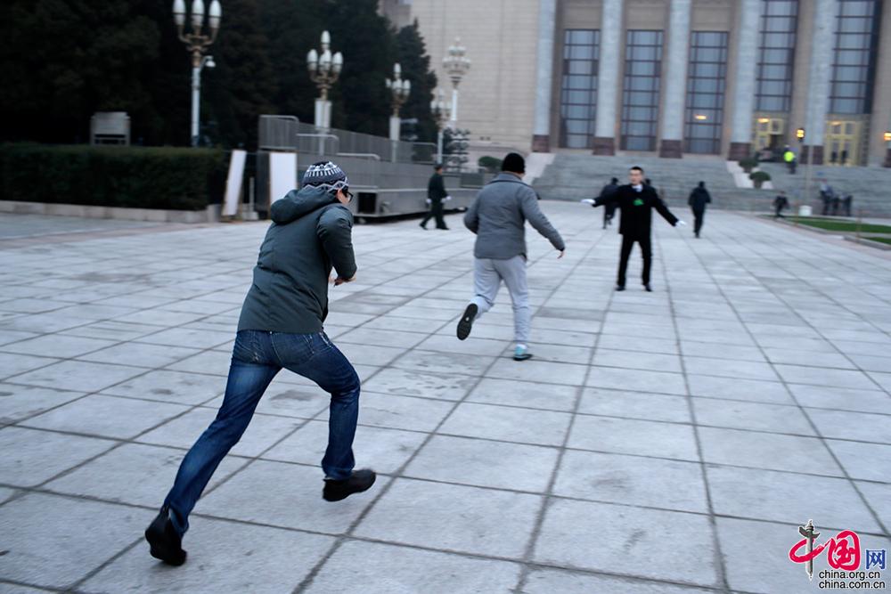 3月5日,第十三届全国人民代表大会第二次会议在北京人民大会堂开幕。参加采访的记者凌晨就在大会堂前排起了长队等待入场,图为记者们负重以百米冲刺的速度奔入会场抢占机位。中国网 杨佳摄影