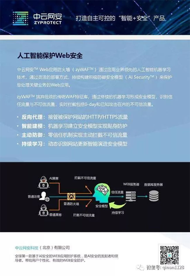 中云网安的技术人员结合自己多年“人工智能+安全”的研发经验,结合人工智能保护Web安全的产品部署实践,阐释了以“反向代理、智能建模、主动防御、持续学习”为特色的Web安全防护技术,介绍了一种自主研发、技术先进的网络安全智能防御系统,可大幅提升安全效能。他们生动的范例,从产品的视角提升了与会者对智能网络安全防御的新认识,引发了大家的热烈探究和讨论。