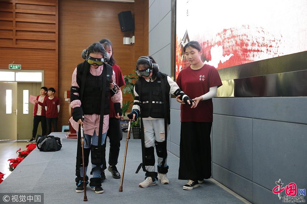 2019年4月7日,重庆市殡葬事业管理中心主办的“感悟生命 感恩生命”生命教育进高校活动在四川外国语大学举行。大学生体验老人走路。图片作者:视觉中国