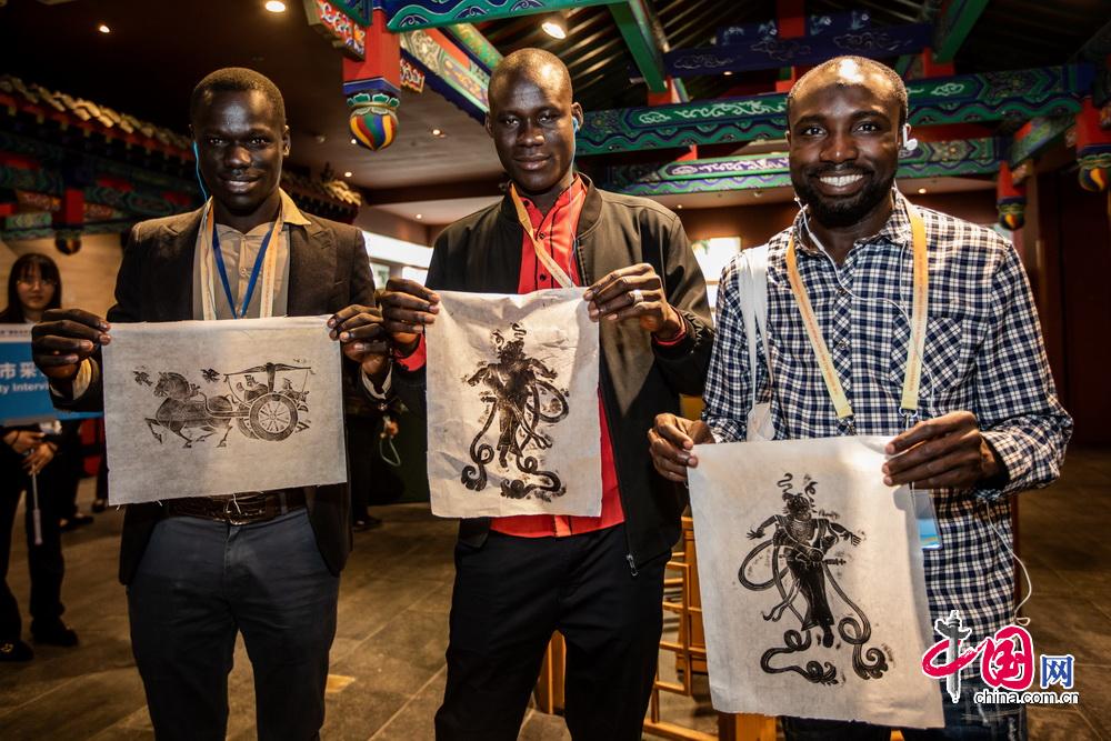 参加第二届“一带一路”国际合作高峰论坛的外籍记者展示亲手创作的版画作品。中国网记者 郑亮摄