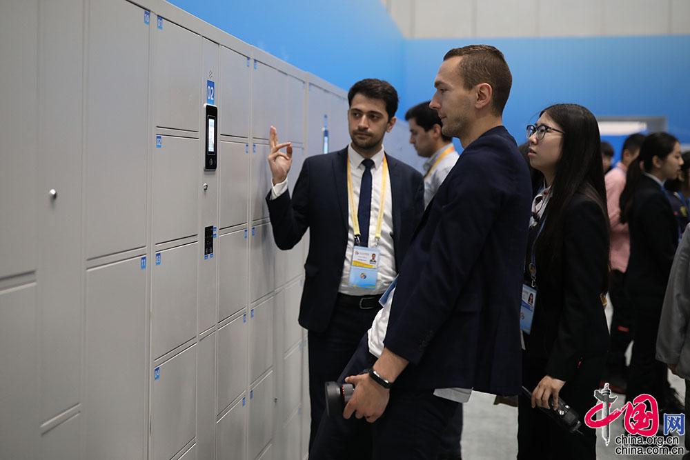 外籍记者在新闻中心内使用人脸识别储物柜。中国网记者 郑亮摄