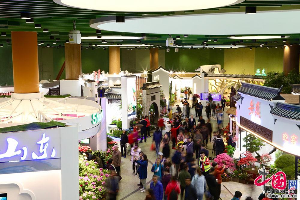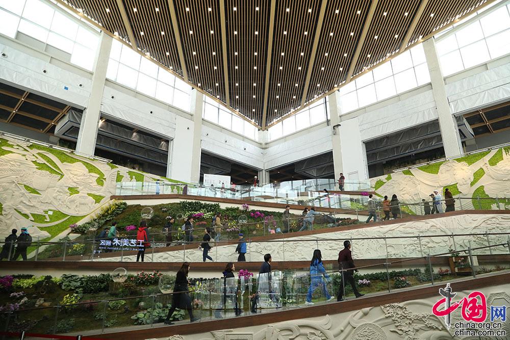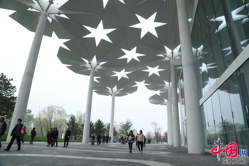 游客在中国馆参观。中国馆是世园会主要场馆之一,中国馆按照“生生不息,锦绣中华”的展陈理念,静态展示与动态演绎相结合,以园艺为载体聚焦中国生态文化,汇聚中国31个省区市园艺产业、生态文明建设成果以及科研院校探索的前沿成果。中国网记者 伦晓璇摄影