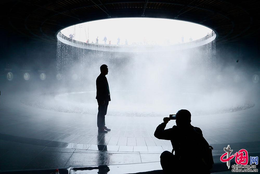 游客在中国馆地下雨水调蓄池前留影。中国馆屋顶设置了雨水收集系统,搭配地下的雨水调蓄池,回收处理后的雨水可以用于灌溉。中国网记者 伦晓璇摄影
