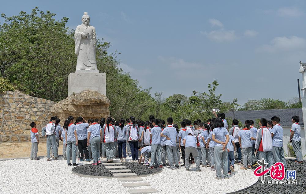 图为在伊尹像前,学生们在接受中医传统文化熏陶。