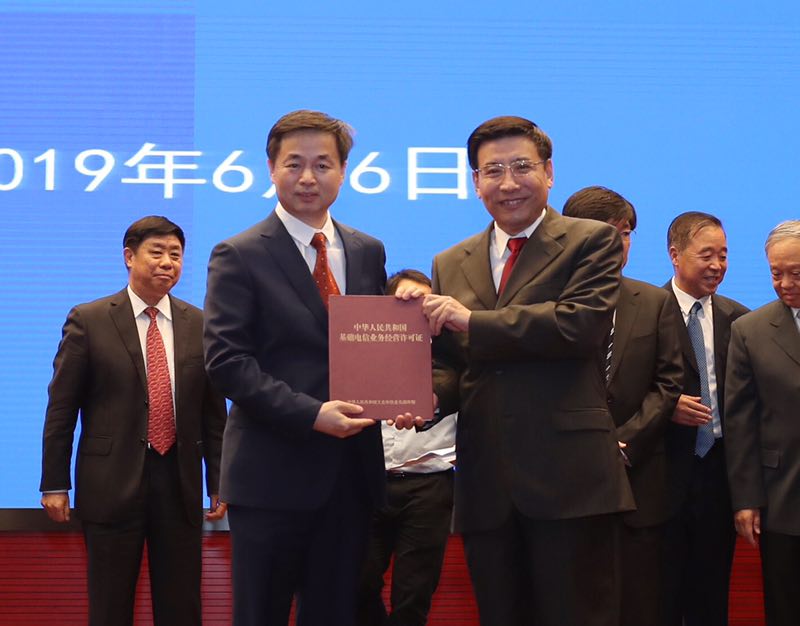 工业和信息化部部长苗圩向中国电信集团有限公司董事长柯瑞文颁发许可证。