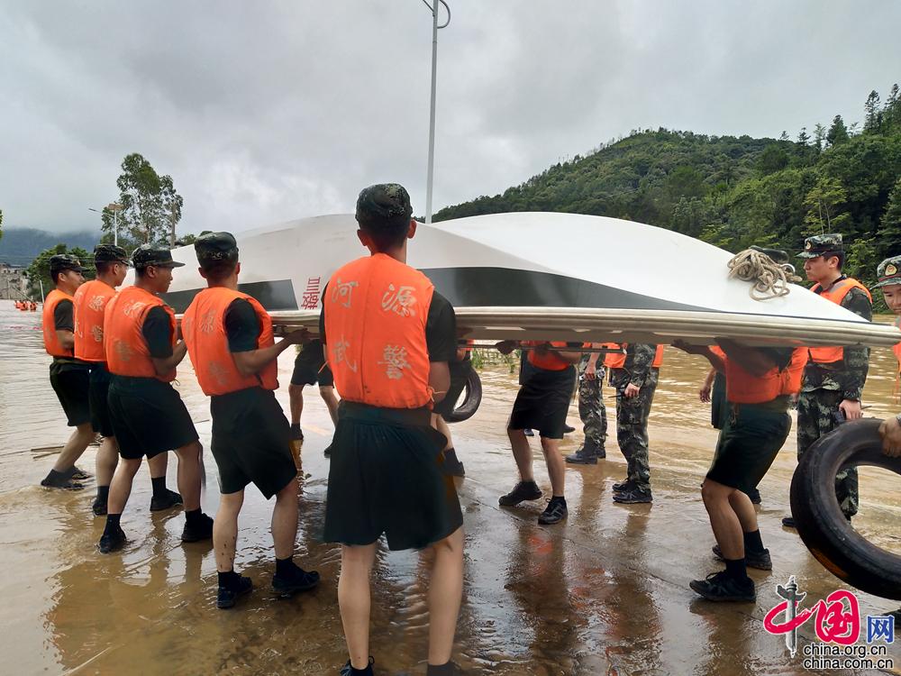 图为武警河源支队官兵协力搬运冲锋舟实施救援。