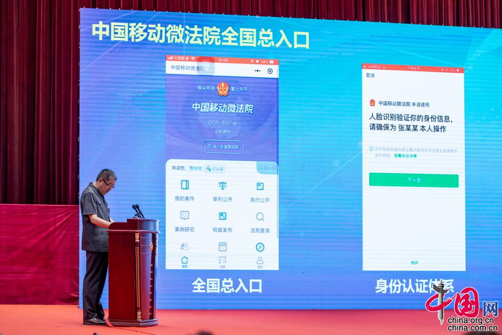 座谈会现场,最高人民法院信息中心主任许建峰介绍中国移动微法院相关情况。