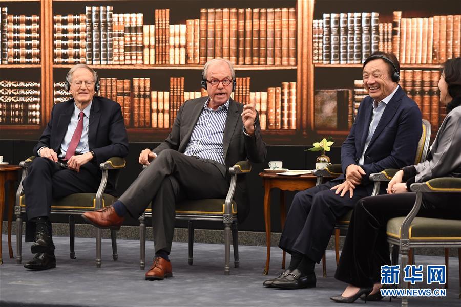 6月17日,华为公司创始人、CEO任正非(右二)与美国学者乔治·吉尔德(左一)、尼古拉斯·内格罗蓬特(左二)在深圳总部就“技术、市场和企业”主题进行对话。 新华社记者 梁旭 摄