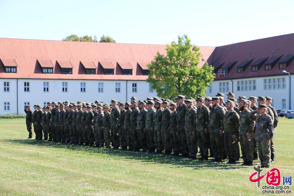 升旗仪式上,中德两军参演官 兵军容严整、士气高昂。德方总导演、卫勤作战支援司令部副参谋长兼作战计划处处长指挥长凯.施密特(Kai Schmidt)上校,中方指挥长、中部战区总医院副院长谭映军大校分别致辞。