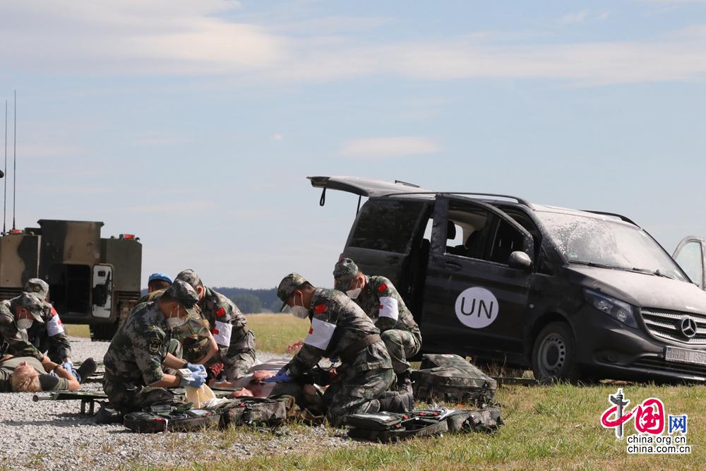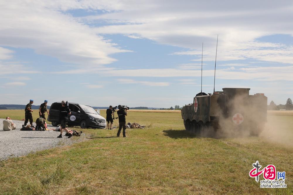 模拟难民营旁边两军人员正在展开联合训练。炸弹袭击导致商务车内8人受伤,其中4名重伤员、4名轻伤员,期间,我军履带式装甲急救车、高机动型野战急救车紧急停靠在迎接后送急重症伤员的最佳位置,该车主要用于战场伤员前接后送和途中不间断急救,车厢自带电源,即使在车辆出现故障的情况下也可独立运作。中方急救军医、白求恩医务士官学校教务处长王营介绍,“这辆救护车装有特种装甲钢板,能够抗地雷冲击,防轻武器射击和弹片,更好地满足战时伤病员转运救治防护需求。”另外,我军携带的高机动型卫生防疫车是演习中唯一一台具备大面积消杀功能的专业技术车辆,对我军卫勤装备的先进性能表示赞赏。德军用于现场救护的装甲救护车非常先进,狐式装甲救护车能够一次运送1名卧位或2名坐位伤员,而拳师犬式装甲救护车可一次运动3名卧位或6名坐位伤员,均具备防弹、越野型和涉水性能好等特点,体现了德军装备模块化发展的思路。