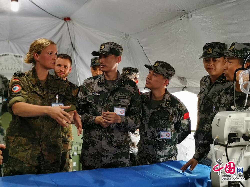 中国网7月7日讯(通讯员 周娜 彭振纲) 6日,“联合救援-2019”中德卫勤实兵联合演习整合训练阶段进入第二天,参演的两军官兵走进对方的卫勤装备进行参观交流,为肩并肩开展此次联合救援行动打下基础。