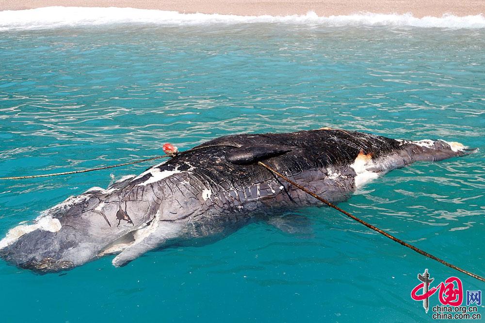 当地时间2019年7月10日,土耳其穆格拉,当地海滩冲上一条三米长的鲸鱼尸体,引不少人围观拍照。