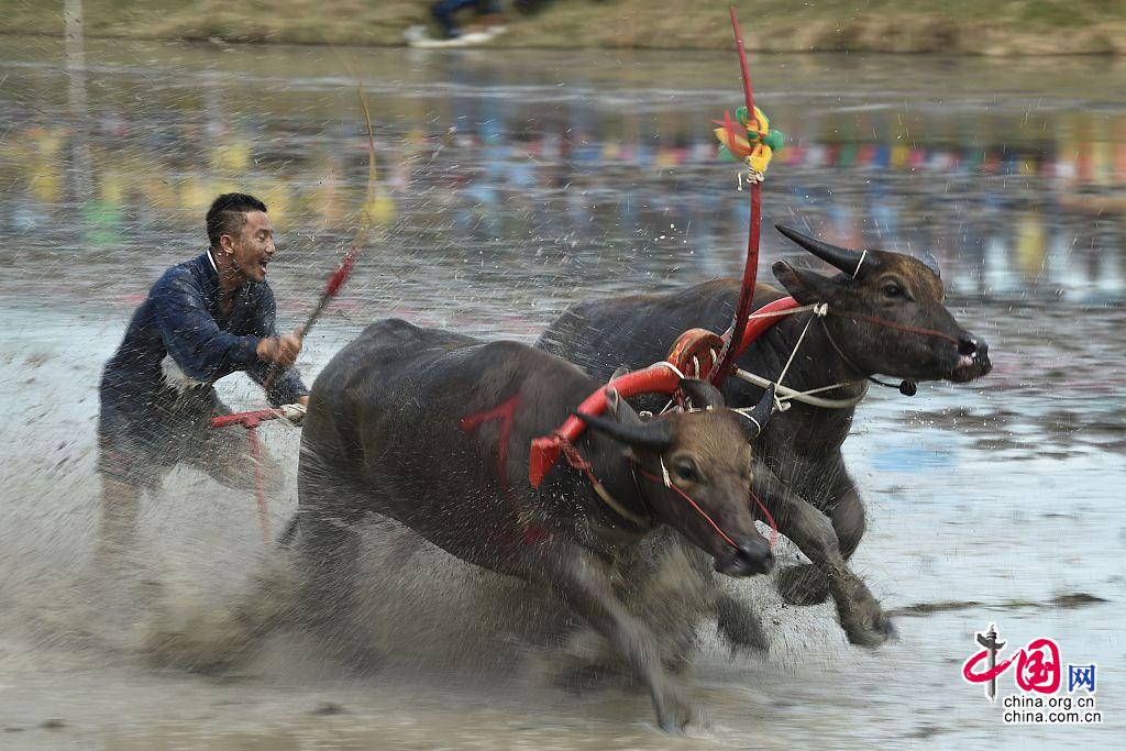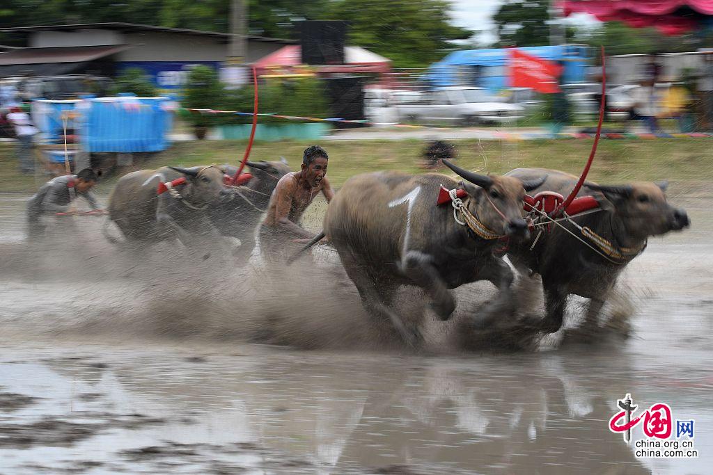 当地时间2019年7月21日,泰国春武里,当地举办水牛赛跑。图片来源:LILLIAN SUWANRUMPHA /视觉中国