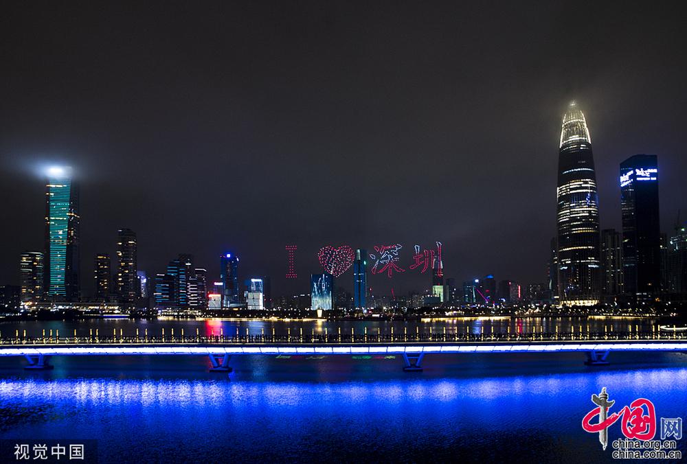 8月11日晚,深圳湾上演惊艳一幕。大楼荧幕亮起巨幕五星红旗,600架无人机编队组成“我爱你中国”、“我爱香港”等标语,点亮“最美中国红”。视觉中国