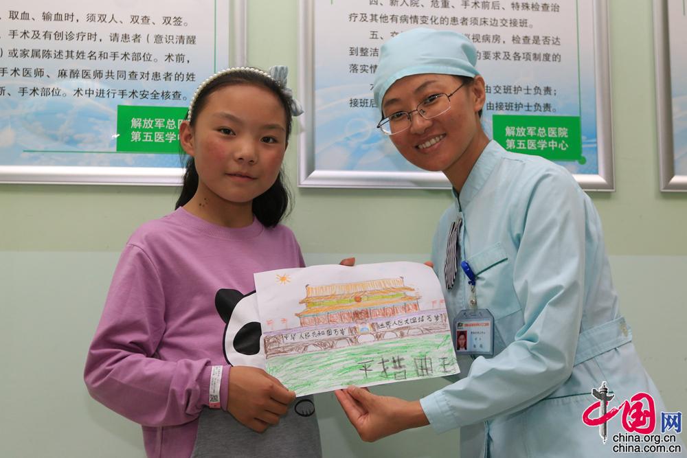藏区小患者出院前夕,把自己的精心画作送给护士长白瑛。 陈爱平 摄
