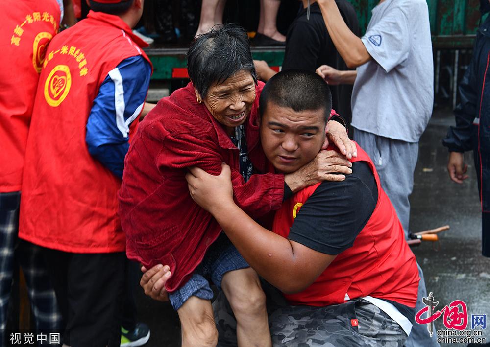 2019年8月12日,山东滨州邹平,高新街道高新小学安置点,志愿者抱起行动不便的群众。李晓伟/视觉中国
