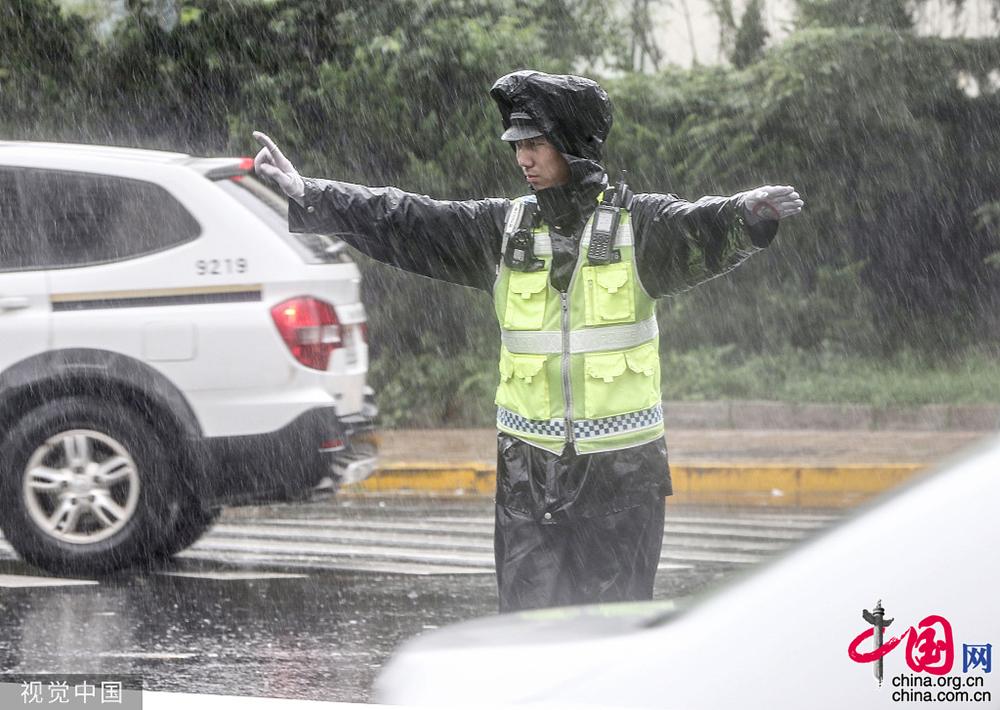 2019年8月11日,受今年第9号台风“利奇马”(热带风暴级)影响,青岛地区风雨交加,海浪打上路面,部分道路交通管制。肖建/视觉中国