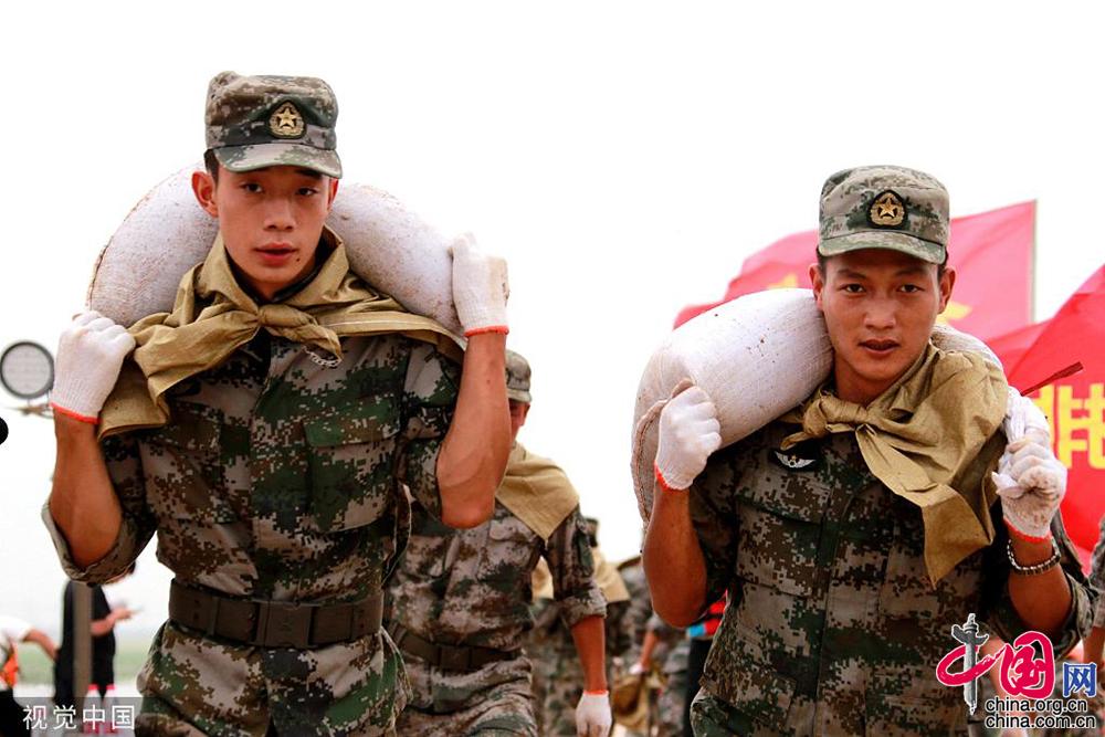 2019年8月13日,山东潍坊,1000余名救援人员手拿肩扛,将沙袋、木板等救援物资步行运至近一公里外的大坝决堤处。受超强台风“利奇马”影响,被誉为“中国蔬菜之乡”的山东寿光及周边县市自8月10日起普降特大暴雨,灾情较为严重。12日18时许,寿光市弥河羊口镇西堤出现缺口,千余军民共同封堵缺口,加固河堤。梁犇/视觉中国