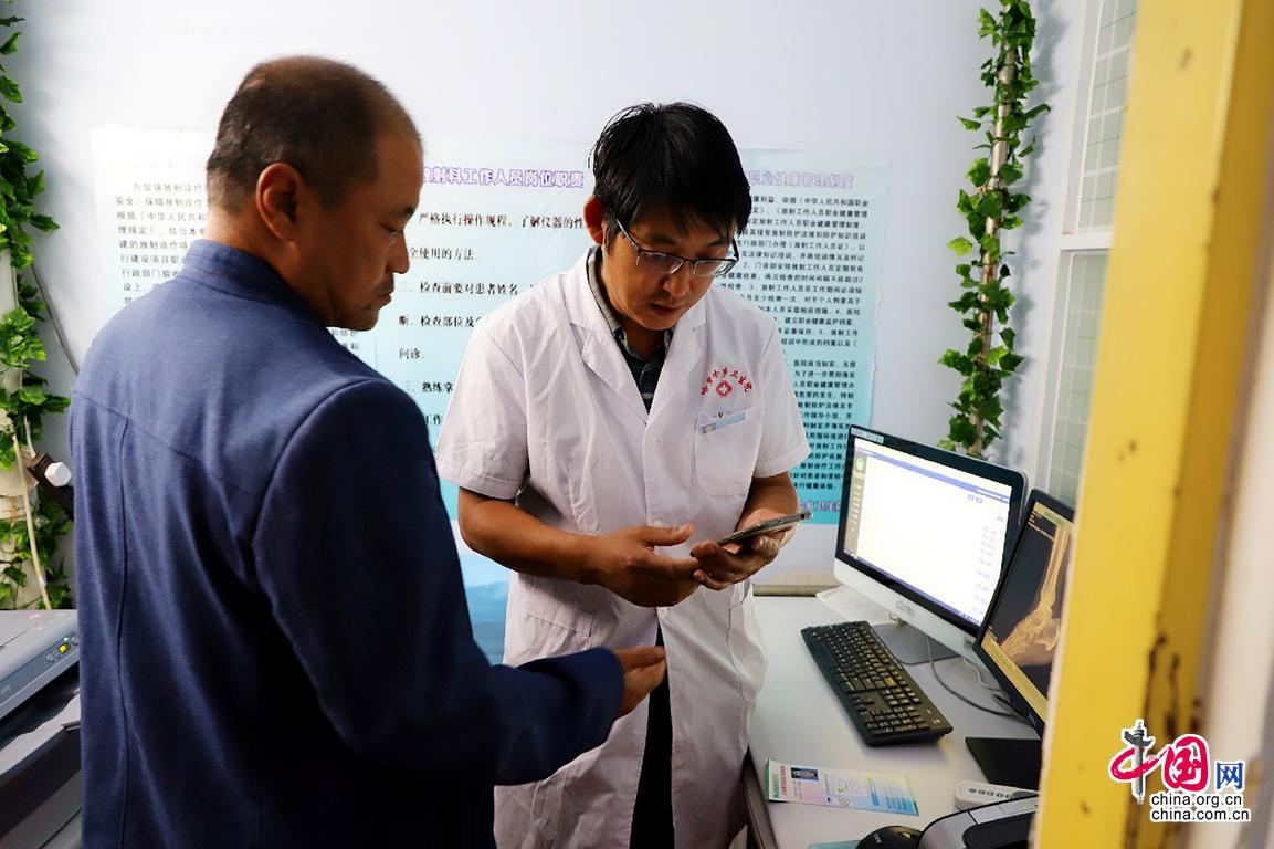 哈里哈乡卫生院放射科医生王洪强正在为村民扫码查看县医院传回来的诊断结果。中国网记者 乔娅丽 摄